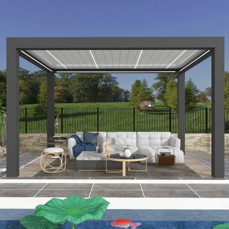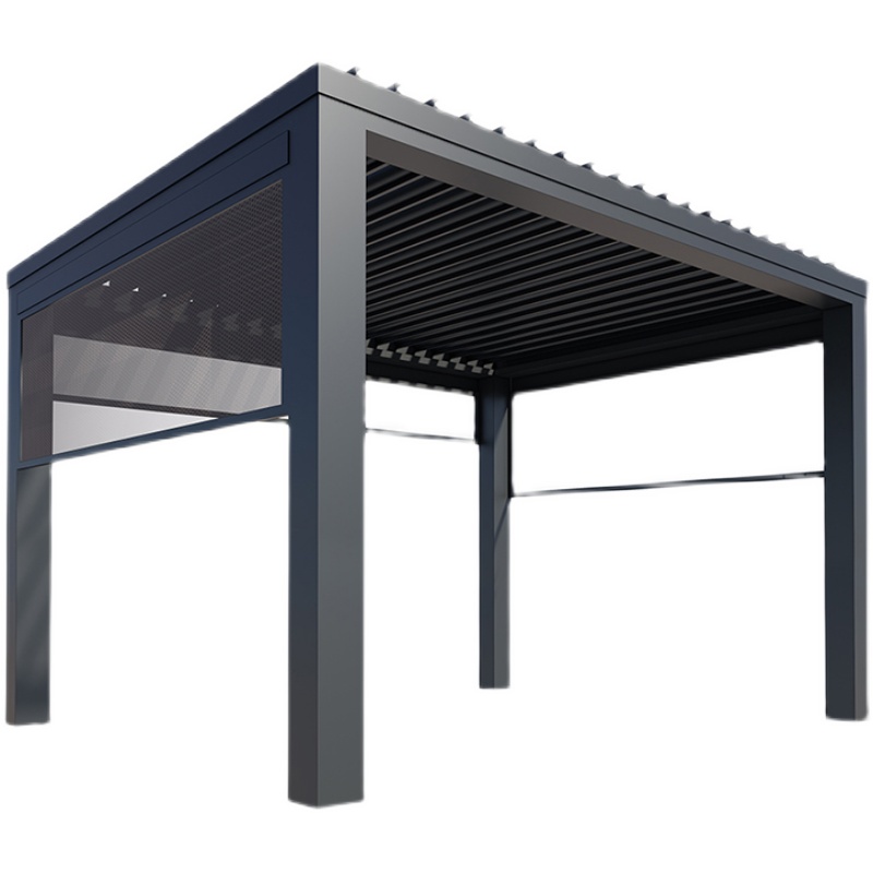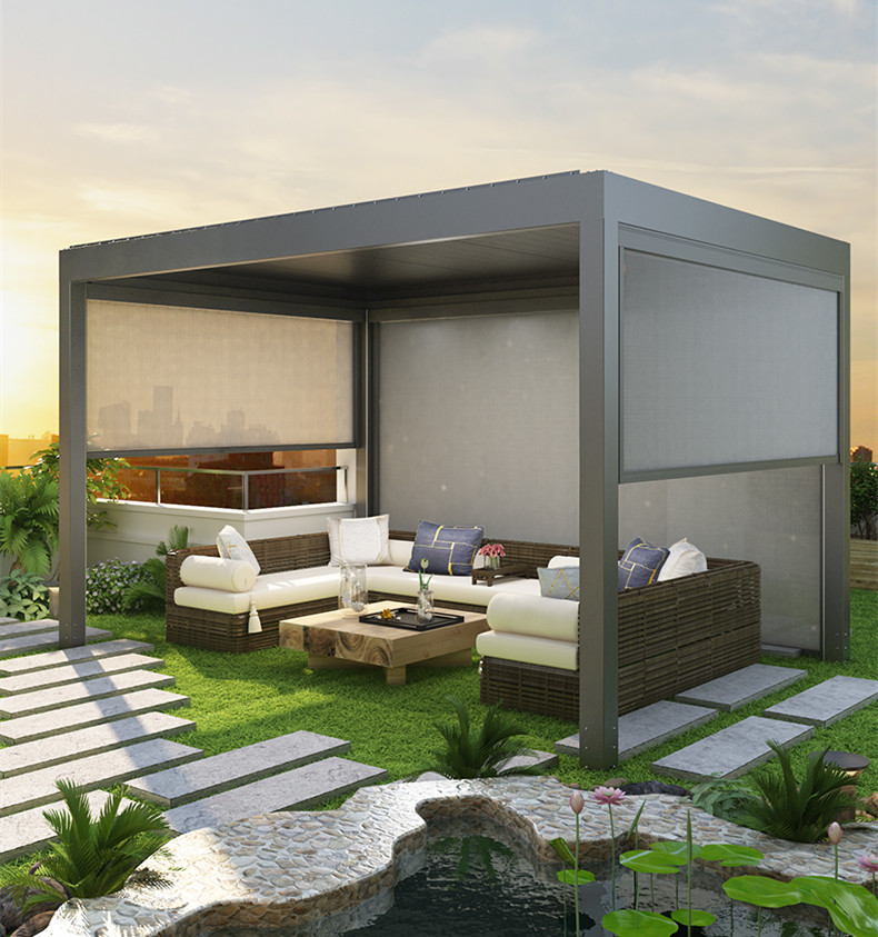 A tetőszerkezet forgatható alumínium lamellákból áll, melyek motoros működtetéssel, távirányító segítségével szabályozhatók.