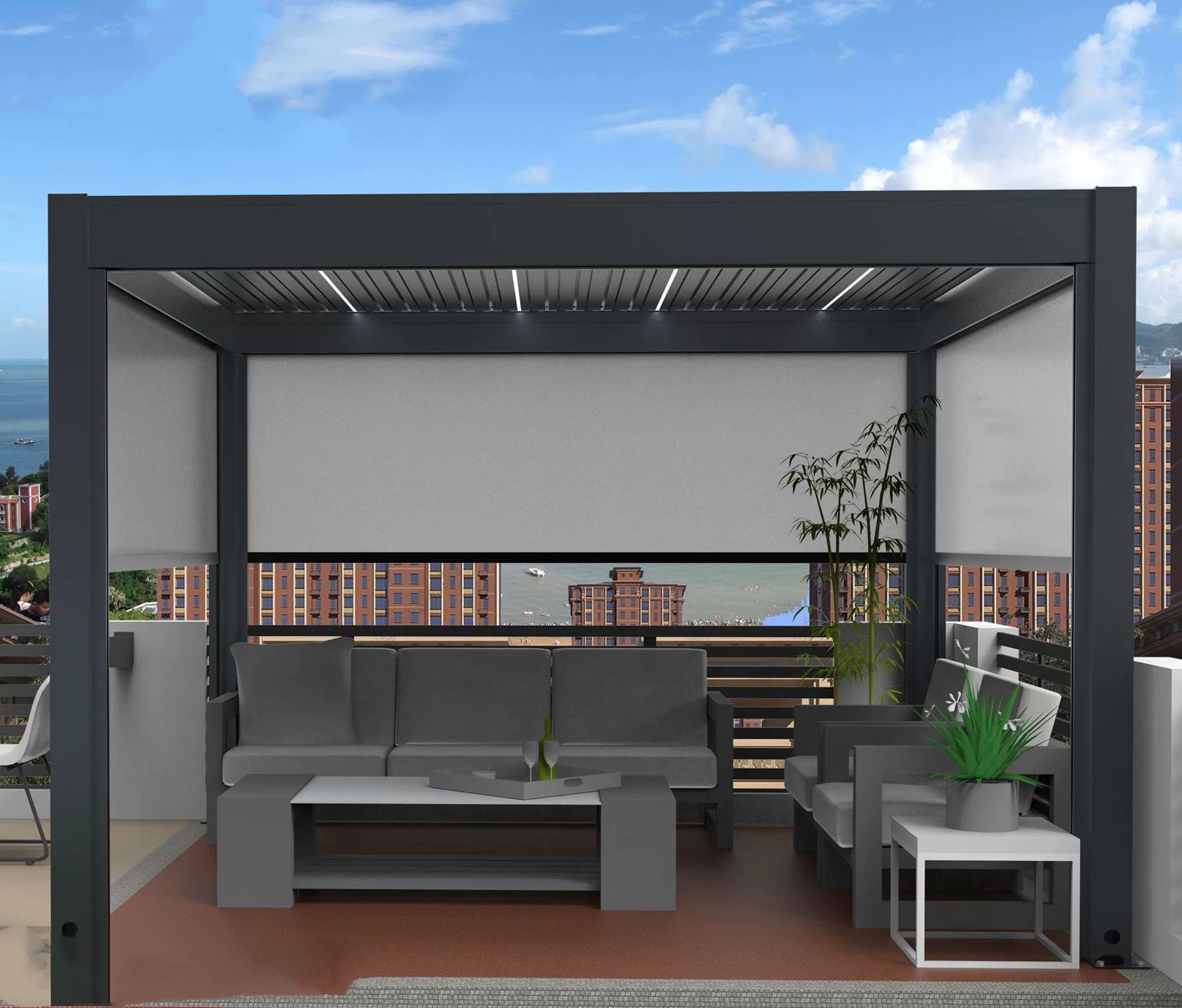 A pergola teljes váza nagy szilárdságú, porfestett alumíniumból készül, amely ellenáll az UV-sugárzásnak, csapadéknak és hőingadozásnak. Rozsdamentes kialakítása hosszú élettartamot és minimális karbantartási igényt biztosít.